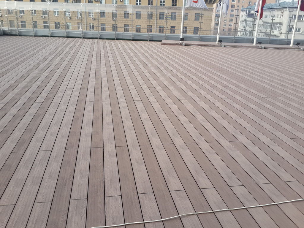 Для ее обустройства использовались регулируемые опоры NewMaxi, лаги из ДПК, доска террасная WOOZEN для финишной отделки крыши. Отличительной особенностью террасных досок является возможность укладки ее под разными направлениями для преломления лучей света и создания на эксплуатируемой поверхности стильного, оригинального узора.
